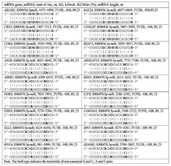 The results shown in Figure 3 confirm the conclusions drawn from the results shown in Table S2. The obtained characteristics of the interaction of miRNA with mRNA of cancer candidate genes should also be taken into account when considering the interaction of miRNA with mRNA. For example, miR-466 binds with the ABLIM1, BAZ2A, CBX3, CD3EAP, CDK6 and REEP3 mRNAs to a greater extent than ID00436.3p-miR because the free energy binding of miR-466 is greater than that of ID00436.3p-miR (Table S2). Similarly, miR-574-5p will bind more strongly to the mRNA of the target genes ANO8, ARHGAP35, ARRB1, BDH1, DOK6, E2F8, EHD3, FAM163A, GLI2, MNT, WNT4 and ZRANB1 than ID00470.5p-miR because the free energy of interaction with mRNA is greater in miR-574-5p (Table S2). As the MirTarget program considers the interaction of the noncanonical pairs A-C and G-U, the interaction of miRNAs and mRNAs preserves the spiral structures of both molecules, and therefore, stacking interactions are found between all nucleotides of miRNA and mRNA, which stabilize the duplex [27].