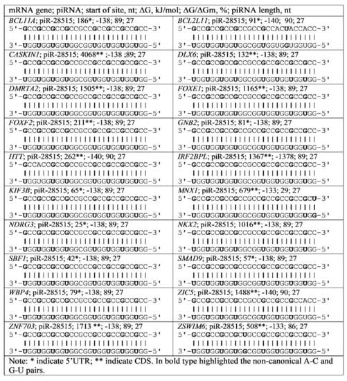 Figure 6 shows the scheme of piR-28515 binding with repeats of the GCC triplet in the 5′UTR and CDS mRNA of the BCL11A, BCL2L11, CASKIN1, DLX6, DMRTA2, FOXE1, FOXF2, GNB2, HTT, IRF2BPL, KIF3B, MNX1, NDRG3, NKX2, SBF1, SMAD9, WBP4, ZIC5, ZNF703 and ZSWIM6 genes.