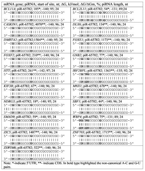 piR-65782 and piR-478 bound the CGC triplet repeats in mRNA of the BCL11A, BCL2L11, CASKIN1, DLX6, DMRTA2, FOXE1, FOXF2, GNB2, HTT, IRF2BPL, KIF3B, MNX1, NDRG3, SBF1, SMAD9, WBP4, ZIC5, ZNF703, and ZSWIM6 genes. Examples of interaction schemes for piR-65782 genes are shown in Figure 7.