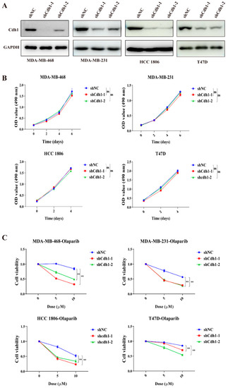 Cdh1 depletion sensitizes breast cancer cells to PARPi. (A) Western blotting analysis of Cdh1 in MDA-MB-468, MDA-MB-231, HCC 1806 and T47D cells with Cdh1 depletion via two independent shRNAs; (B) growth analysis of MDA-MB-468, MDA-MB-231, HCC 1806 and T47D cells with or without Cdh1 depletion; (C) Cell viability assay of MDA-MB-468, MDA-MB-231, HCC 1806 and T47D cells transduced with scrambled shRNA (NC) or shRNA against Cdh1 in response to Olaparib (0 μM 0, 5 μM and 10 μM) for 96 h, (** p < 0.01; ns: p ≥0.05).