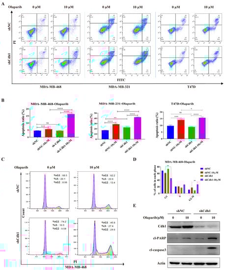 Next, we sought to determine the effects of olaparib on the Cdh1-depleted cells. The results from the apoptosis assay showed that a 96 h PARPi treatment could induce apoptosis in all tested cell lines. Importantly, Cdh1 depletion can substantially increase the apoptotic effect of PARPi on TNBC cells, but not on non-TNBC (T47D) cells (Figure 3A,B). Furthermore, cell cycle analysis of MDA-MB-468 cells suggested that PARPi significantly increased the proportion of cells in the G2-M phase of the cell cycle in Cdh1 depleted cells (Figure 3C,D). Consistently, caspase-3 activation and proteolytic cleavage of PARP-1 were apparent in PARPi treated Cdh1 deficient cells (Figure 3E). These results indicated that the anti-proliferation effect of PARPi in Cdh1 depleted TNBC cells was associated with apoptosis and G2-M phase cell cycle arrest.