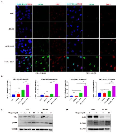 G2-M phase cell cycle arrest and apoptosis are normally associated with increased DNA damage. To assess whether PARPi can induce DNA damage in Cdh1 depleted TNBC cells, we performed immunofluorescence by using two DSB surrogate markers: γH2AX and 53BP1. The results showed that the number of PARPi induced γH2AX foci in Cdh1 depleted cells was increased more than that in control cells in MDA-MB 468 and MDA-MB 231 cells (Figure 4A,B). Similarly, the number of PARPi-induced 53BP1 foci in Cdh1 depleted cells increased more than that in control cells in MDA-MB-468 and MDA-MB-231 cells, respectively (Figure 4A,B). Western blotting analysis in MDA-MB-468 cells also indicated that PARPi could induce substantially increased levels of γH2AX and cause checkpoint activation in Cdh1 depleted cells (Figure 4C,D). In conclusion, PARPi can elicit increased levels of DNA damage and checkpoint activation in Cdh1-depleted TNBC cells.