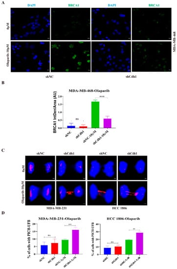 We next investigated the possible mechanisms by which Cdh1 augments the sensitivity to PARPi in TNBC cells. We previously showed that Cdh1 is required for efficient HR through facilitating BRCA1 recruitment to DSBs that are caused by microirradiation or prolonged hydroxyurea (HU) treatment [12]. Our immunofluorescence analysis showed that PARPi could substantially increase BRCA1 foci formation, indicating that PARPi-induced DNA damage might need BRCA1 to repair. Most importantly, when Cdh1 was depleted, PARPi-induced BRCA1 foci was substantially compromised, suggesting that Cdh1 is required for BRCA1’s foci formation in response to PARPi (Figure 5A,B).