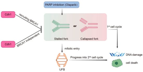 Model for Cdh1 function in genomic stability in response to PARP inhibition. During S phase, PARPi induces stalled or collapsed forks. Cdh1 prevents stalled or collapsed forks accumulation either through recruiting BRCA1 or its other functions that are not related to BRCA1. When Cdh1 is absent, excessive stalled or collapsed forks can directly lead to DNA damage and cell death in the first cell cycle; or upon mitotic entry, these abnormal replication structures generate ultrafine DNA bridges, which affects sister chromatids segregation leading to DNA damage and cell death in the next cell cycle.