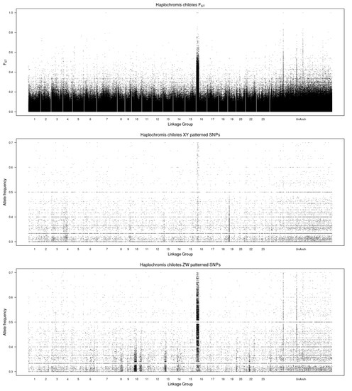 - Feller, A.F.; Ogi, V.; Seehausen, O.; Meier, J.I. Identification of a novel sex determining chromosome in cichlid fishes that acts as XY or ZW in different lineages. Hydrobiologia 2021, 848, 3727–3745. [Google Scholar] [CrossRef] [PubMed]