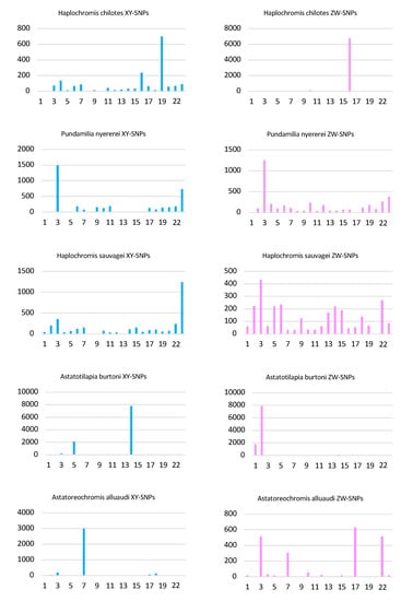 - El Taher, A.; Ronco, F.; Matschiner, M.; Salzburger, W.; Böhne, A. Dynamics of sex chromosome evolution in a rapid radiation of cichlid fishes. Sci. Adv. 2021, 7, eabe8215. [Google Scholar] [CrossRef]