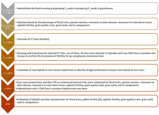 In the first step, F1 seeds were produced by hand crossing 2012; in the next year, pure seeds of two rice hybrids were grown and F2 seeds were harvested on a single-plant basis. These F2 seeds and subsequent generations were grown in the field and subjected to generation advancement coupled with selection for phenotypic performance and grain yield per plant, spikelet fertility, number of days to 50% flowering, panicles per plant, plant height, panicle excretion, anther length (AL), anther breadth (AB), and filament length (FL) (Figure 1). During rice season 2015, a set of 57 iso-cytoplasmic restorer lines were generated from the two hybrids. The crop was grown following recommended agronomic practices and plant-protection measures to ensure proper crop growth. Restorer lines of 57 iso-cytoplasmic populations along with the parental lines were evaluated for phenotypic performance and yielding ability. Out of 57 iso-cytoplasmic restorer lines, the best 23 lines, selected based on their phenotype and yield ability, were hybridized with two cytoplasmic male sterile lines. Out of 23 iso-cytoplasmic restorer fertility lines, the best 4 lines based on their phenotype, grain yield, and results of test cross, were selected for hybridization with two CMS lines; G46A and IR69625A. In the next year 4 iso-cytoplasmic restorer lines were grown; a commercial hybrid rice variety (Egyptian Hybrid 1), maintainer lines, and new hybrids were produced from it for an evaluation in a randomized complete block design (RCBD) with three replications compared to during 2020 (Figure 1).