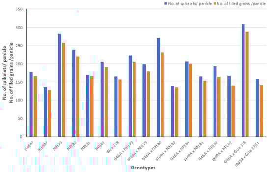 The pollen fertility percentage of tested hybrids varied from 91.37% (G46A × Giza 178) to 98.22% (G46A × NRL80). On the contrary, the spikelet-fertility percentage of tested hybrids was varying from 87.35% (G46A × NRL82) to 95.08% (G46A × NRL80) (Table S1).