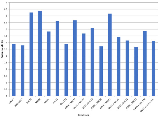 The data showed that IR69A × NRL80 and G46A × NRL81 showed the highest values of pollen fertility (%), respectively (Table S1). Concerning, HD and PH, most of the new hybrids showed values acceptable and like the check hybrid. For P/P, five hybrids—IR69A × NRL82, G46A × NRL82, G46A × NRL80, IR69A × NRL79, and G46A × NRL81—showed the highest values, respectively. Regarding PL, the hybrids G46A × NRL80 and G46A × NRL81 showed the highest values, respectively. Concerning Sp/P, eight hybrids showed the highest values over hybrid commercial variety. The hybrids G46A × NRL79, G46A × NRL80, and G46A × Giza 178 showed the highest values of Sp/P, respectively (Table S1 and Figure 3). For FG/P, six hybrids showed the highest values over hybrid commercial variety. The hybrids G46A × NRL79, G46A × NRL80, and G46A × Giza 178 showed the highest values of FG/P, respectively (Table S1 and Figure 3). The highest values of PW were observed in seven hybrids: the hybrids G46A × NRL80, G46A × NRL79, and G46A × NRL81 (Table S1 and Figure 4). For 1000-GW, all hybrids showed values higher than the hybrid commercial variety. The highest values were observed in the hybrids IR69A × NRL82, IR69A × NRL81, G46A × NRL81, and G46A × NRL82, respectively (Table S1 and Figure 5). The data showed that all hybrids under study showed values higher than hybrid commercial variety for GY/P. The highest values were observed in the hybrids IR69A × NRL82, IR69A × NRL81, G46A × NRL79, IR69A × NRL79, G46A × NRL80, and G46A × NRL81, respectively, (Table S1 and Figure 6).