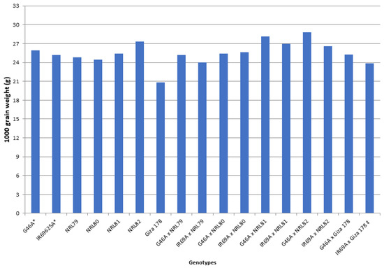 Furthermore, three, four, and eight hybrids showed highly significant positive values in BP heterosis, MP heterosis, and SH, for 1000-GW, respectively. In addition, 1000-GW is one of the most important traits that directly affect the potential for grain yield in rice varieties and hybrids. These results are similar to the results obtained by [26,43,45,46,47,51,52,58,61,62,63,64,65,66,67,68].