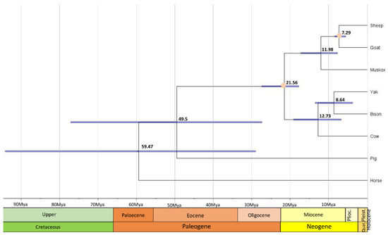 To construct the phylogenetic tree, 1:1 orthologous genes were identified among 8 species (muskox-Ovibos moschatus, sheep-Ovis aries; GCA_000298735.1, goat-Capra hircus; GCA_001704415.1, cow–Bos taurus; GCA_002263795.2, horse -Equus caballus; GCA_002863925.1, pig–Sus scrofa; GCA_000003025.6, bison–Bison bison bison; GCA_000754665.1, yak–Bos gruniens; GCA_000298355.1). Using PorthoMCL [40], 1:1 orthologous genes were then identified and corresponding coding sequences were aligned using Clustal-Omega. All alignments were concatenated using FasConCat v.1.04 software [41], and Jmodeltest v.2.1.10 was used to predict the best-fit model of nucleotide substitution [42]. A maximum likelihood tree was then generated in RAxMLv8 [43] using the GTR+I+G model with 1000 bootstrap replicates and horse as the outgroup. MCMCtree from the PAMLv4 package [44] was used to convert the tree to an ultrametric format and to calibrate the nodes with known split times. Calibration minimums and maximums were given for sheep-goat divergence (3.9–8.1 MYA) from Chen et al. [45] and for sheep-cow divergence (18.3–28.5 MYA) from Benton and Donoghue [46].