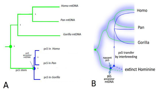 The evidence for interspecies hybridization presented here comes from a special type of pseudogenes (“NUMTs”) that are fragments of mitochondrial DNA (mtDNA) integrated into the nuclear genome. There are hundreds of NUMT sequences in the human genome [19]. The NUMTs found in the present-day human genome have been inserted into nuclear DNA since tens of millions of years ago and this process continues today (Srinivasainagendra 2017). We have recently reported evidence that the insertion of NUMTs into the nuclear genome might have accelerated during the emergence of the genus Homo [20]. NUMTs are considered “DNA fossils” since they preserve ancient mtDNA sequences virtually unchanged due to a significantly lower mutational rate in the nuclear versus mitochondrial genome [21]. NUMTs, therefore, offer an opportunity to peek into the distant past of populations [22,23,24]. Here, we demonstrate that a NUMT on chromosome 5 descends from a mitochondrial genome that had been highly divergent from our ancestors’ mtDNA at the time of becoming a pseudogene. This implies that this pseudogene should have been created in an individual from a (hominine) species that at the time of insertion was highly diverged from our direct ancestor. For this pseudogene to end up in our genome, this (now extinct) hominine should have hybridized with our direct ancestors. Moreover, our analysis of additional NUMTs with similar phylogenic history implies that this scenario was not unique.