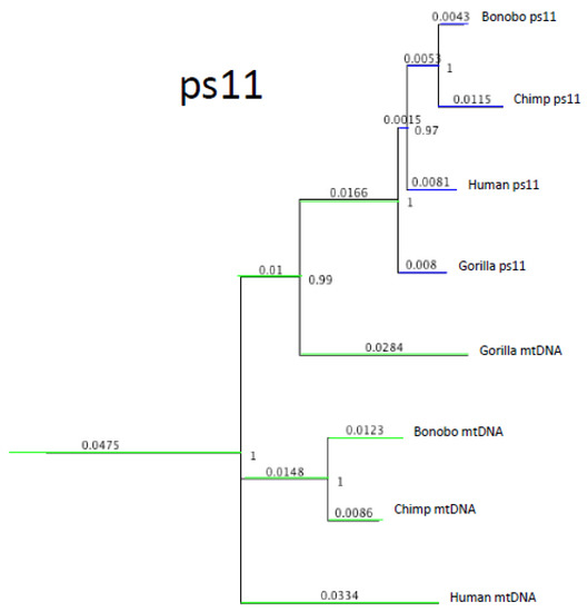 Ps5 is not the only mtDNA pseudogene that implies an interspecies hybridization event. Another pseudogene with a similar evolutionary history has been found on chromosome 11. Overall, the joint tree topology of the ps11 NUMT with mtDNA (Figure 3) is similar to that of ps5 (i.e., a long common pseudogene stem consisting of highly synonymous “mitochondrial” mutations and subsequent divergence among humans, chimpanzees, and gorillas). However, this pseudogene shows consistently higher similarity to the mtDNA of the gorilla than to that of other hominines (note a common stem segment with gorilla mtDNA in Figure 3). Note that in this case, the shape of the mtDNA sub-tree poorly reflects the evolutionary history of humans, chimpanzees, and gorillas. This is because NUMT ps11 is homologous to the rRNA section of the mitochondrial genome. This genome segment is known to poorly reflect evolutionary history, possibly because of excessive selection pressures.