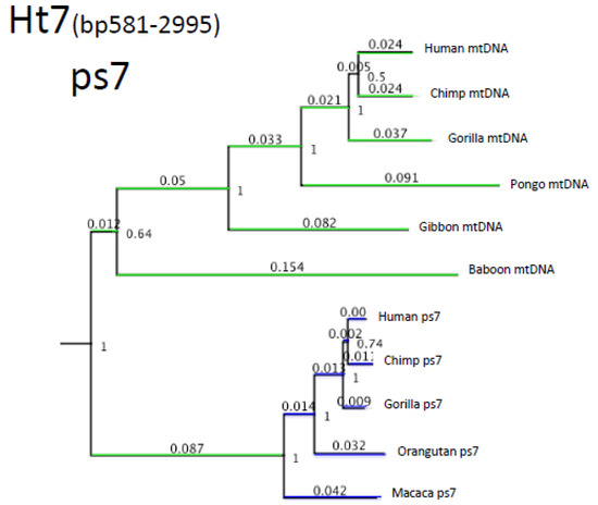Phylogenetics of the pseudogene Ps7 and old-world monkey mtDNA.