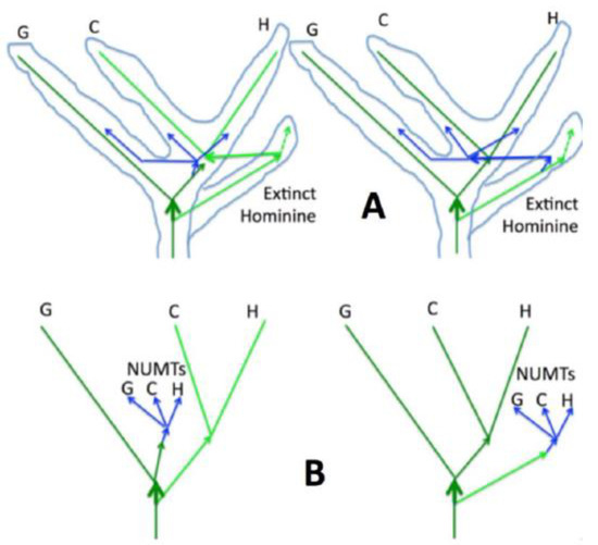 Comparison of the NUMT transfer (right) and the mtDNA introgression (left) scenarios of hybridization. (A) represents the inferred events, (B) represents the resulting observed phylogenies. Blue arrows represent the NUMTs, and light blue lines depict the superposition of the phylogenetic trajectories of all the nuclear genetic loci, as in Figure 1B. The mtDNA genealogies are green. Horizontal arrows represent introgression of mtDNA (green) or transfer of the NUMT locus between extinct hominine and the HCG mitochondrial (blue). Extinct hominine mtDNA lineage is neon green, the HCG mtDNA lineage is forest green.