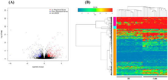 (A) Volcano plot showing differentially expressed genes (DEGs) in spleen between BY and Cobb chickens after Salmonella infection (log2 FC ≥ 1 and padj < 0.05). (B) The heat map based on DEGs of the RNA-seq data.