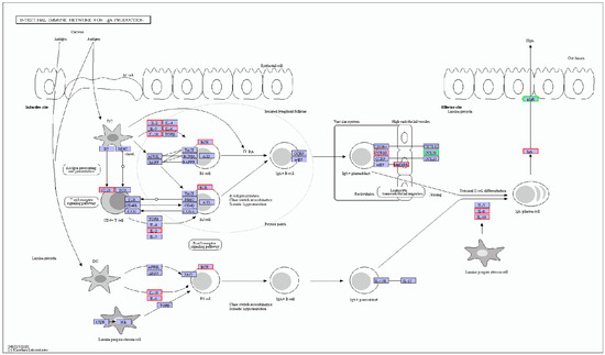 IgA-production-signaling pathway. Green, significantly downregulated DEGs. Red, significantly upregulated DEGs.