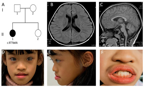Clinical manifestations and auxiliary examinations of the case 1. (A) Family pedigree of case 1. (B,C) Brain MRI scans demonstrating mild enlarged ventricles and an absence of other structural brain anomalies (T1-weighted image). (D–F) Distinctive facial features were identified. These included arched eyebrows, rounded palpebral fissures, a depressed nasal root, full nasal tip and anteverted nares. She had a wide mouth, decreased Cupid’s bow, short philtrum, full lips, an anterior reverse bite, enamel hypoplasia, widely spaced teeth, and abnormal gums.
