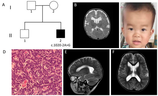 Clinical manifestations and auxiliary examinations of the case 2. (A) Family pedigree of case 2. (B) Brain MRI scans at 42 days demonstrated widened brain ventricle, deep brain sulci and subependymal cyst (axial plane, T2-weighted image). (C) Distinctive facial features were identified. These included protruding forehead, rounded palpebral fissures, large irises, depressed nasal root, full nasal tip and abnormal gums. (D) Hematoxylin and eosin staining of surgical resection demonstrating highly cellular tumor with round nuclei and little cytoplasmic differentiation (original magnification ×200). (E,F) Follow-up brain MRI scans at three years of age still demonstrated enlarged brain ventricle, deep brain sulci and subpendymal cyst (sagittal and axial plane, T2-weighted image).