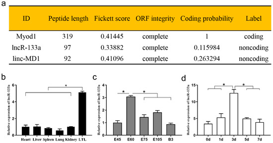 Figure 1. Coding potential and expression profile of lncR-133a. (a) Bioinformatics analysis of the coding potential of lncR-133a, and Myod1 and linc-MD1 served as controls. (b) qRT-PCR analysis of lncR-133a expression in heart, liver, spleen, lung, kidney, and longissimus thoracis et lumborum (LTL) muscle on day 60 of gestation. (c) The expression pattern of lncR-133a in the developmental LTL muscle. (d) The expression levels of lncR-133a during goat MuSC differentiation. Data are means ± standard error of the mean of at least three biological replicates, * p < 0.05.