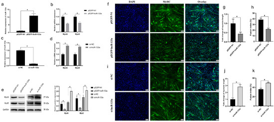 Figure 2. LncR-133a suppresses the differentiation of goat MuSCs. (a) The expression levels of lncR-133a were determined in MuSCs transfected with pEGFP-N1 or pEGFP-lncR-133a. (b) Muscle differentiation marker genes (MyoG and MyoD) expression levels were determined in MuSCs transfected with pEGFP-N1 or pEGFP-lncR-133a. (c) The expression levels of lncR-133a were measured in MuSCs transfected with si-NC or si-lncR-133a. (d) The expression levels of muscle differentiation marker genes (MyoG and MyoD) were determined in MuSCs transfected with si-NC or si-lncR-133a. (e) MyoG and MyoD protein levels were determined in MuSCs transfected with pEGFP-N1 or pEGFP-lncR-133a, si-NC or si-lncR-133a. Image Pro Plus software (version 6.0, Media Cybernetics) was used to calculate the quantification of protein expression. (f) MyHC-stained cells were transfected with pEGFP-N1 or pEGFP-lncR-133a and then cultured in differentiation medium (DM) for 4 days. DAPI stainingwas used to visualize the nuclei of cells (blue). The length (g) and fusion index (h) of myotubes were determined. Scale bars = 100 μm. (i) Immunofluorescence assay for MyHC-stained cells transfected with si-NC or si-lncR-133a then cultured in DM for 4 days. Cell nuclei were visualized with DAPI (blue). Quantified myotube length (j) and fusion index (k) Scale bars = 100 μm. Data are means ± standard error of the mean of at least three biological replicates, * p < 0.05.