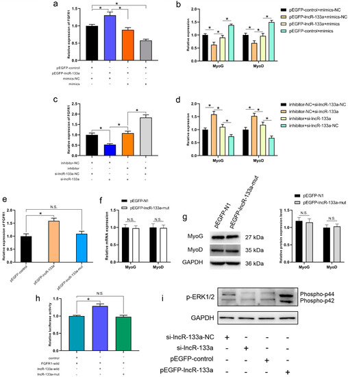 Figure 6. LncR-133a regulates FGFR1 expression and MuSCs differentiation via miR-133a-3p and promotes the phosphorylation of ERK1/2. (a) The expression of FGFR1 was determined after treatment with pEGFP-lncR-133a and/or miR-133a-3p mimics. (b) The expression of MyoG and MyoD were detected after treatment with pEGFP-lncR-133a and/or miR-133a-3p mimics. (c) The expression of FGFR1 was measured after treatment with miR-133a-3p inhibitor and/or si-lncR-133a. (d) The expression of MyoG and MyoD were detected after treatment with si-lncR-133a and/or miR-133a-3p inhibitor. (e) The expression level of FGFR1 in MuSCs transfected with pEGFP-lncR-133a or pEGFP-lncR-133a-mut. (f) The mRNA expression of MyoG and MyoD in MuSCs transfected with pEGFP-N1 or pEGFP-lncR-133a-mut. (g) The protein expression of MyoG and MyoD were determined in MuSCs transfected with pEGFP-N1 or pEGFP-lncR-133a-mut. Image Pro Plus software (version 6.0, Media Cybernetics) was used to compute the quantification of protein expression. (h) To test lncR-133a’s competitive endogenous RNA activity, FGFR1-wild was co-transfected into HEK293T cells with lncR-133a-wild or lncR-133a-mut. (i) LncR-133a promotes the phosphorylation of ERK1/2 during myoblast differentiation. In addition, pEGFP-lncR-133a, si-lncR-133a and Duplex NC were transfected into MuSCs. Next, cells were switched into the differentiation medium approximately 6 h after transfection. The total protein from transfected cells were isolated after culturing in the differentiation medium for 48 h. Data are means ± standard error of the mean of at least three biological replicates, * p < 0.05.