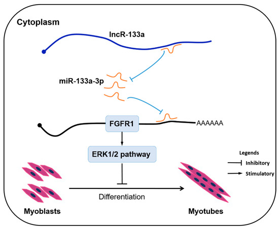 In conclusion, we identified a novel lncR-133a as a sponge for miR-133a-3p to activate FGFR1/ERK1/2 signaling, thus suppressing muscle differentiation (Figure 7). The lncR-133a/miR-133a-3p/FGFR1/ERK1/2 axis may shed light on further understanding the skeletal muscle development mechanism. Furthermore, our findings suggest that lncR-133a is a potential regulatory element for muscle development and myogenesis in goats.