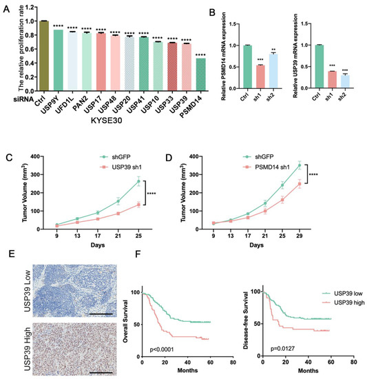 Identification of the DUB that promotes the proliferation of esophageal cancer cells. (A) Each of the 98 human DUB genes was suppressed in KYSE30 cells with pooled siRNAs and the cell proliferation was detected by the CCK-8 assay. (B) Knockdown efficiency of PSMD14 and USP39 in KYSE30 cells was examined by qRT-PCR. (C) Tumor volumes of USP39 silenced KYSE30 cells and control cells. n = 7 mice per group. (D) Tumor volumes of PSMD14 silenced KYSE30 cells and control cells. n = 7 mice per group. (E) Representative images of IHC staining of USP39 in USP39 high expression or USP39 low expression cases. Scale bars, 200 m. (F) Kaplan–Meier analysis of ESCC patients’ overall survival and disease-free survival grouped by low or high expression of USP39 by the log rank test. Data in A, B, C, D are shown as the mean ± S.D. Data were analyzed by one-way ANOVA with Bonferroni correction (A,B) or two-way ANOVA with Bonferroni correction (C,D). ** p < 0.01, *** p < 0.001, **** p < 0.0001.