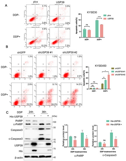 USP39 promotes chemoresistance in ESCC cells. (A) Cell apoptosis detected by the Annexin V-PI assay in USP39-overexpressed KYSE30 and control cells with or without DDP (14 µg/mL) treatment. n = 3. (B) Cell apoptosis detected by the Annexin V-PI assay after USP39 knockdown in KYSE450 cells with or without DDP (7 µg/mL) treatment. n = 3. (C) Representative immunoblotting analysis of the cleaved PARP and Caspase3 expression in USP39-overexpressed KYSE30 cells with DDP treatment. The blot was analyzed by Image J. Relative protein levels were normalized to -actin. Data in A, B, and C represent mean ± S.D and were analyzed by unpaired two-tailed Student’s t-test. ns = no significant, * p < 0.05, ** p < 0.01, **** p < 0.0001.