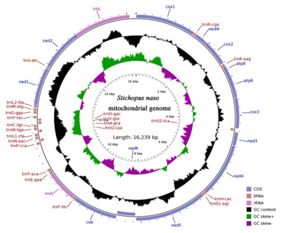 Gene maps of the Stichopus naso mitogenome. Blue arrows represent CDS, brown arrows represent tRNA, and lavender arrows represent rRNA, black, GC content, green, GC skew +, and dark purple, GC skew −.