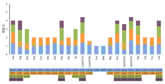 Relative synonymous codon usage in the Stichopus naso mitogenome. Codon families are indicated below the X-axis.