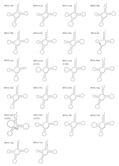 Putative secondary structures of tRNAs from the Stichopus naso mitogenome. The tRNAs are labeled with the abbreviations of their corresponding amino acids.