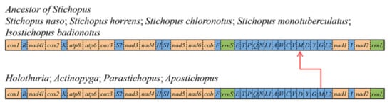 Furthermore, S. horrens, S. chloronotus, S. monotuberculatus, and S. naso were found to have the same mitochondrial gene order, which was preliminarily identified as the ancestral gene order of Stichopus (Figure 4). It is possible that the ancestral gene order of Stichopus could be finally verified as more complete mitochondrial sequences in Stichopus are acquired. In addition, Holothuria, Actinopyga, Parastichopus, and Apostichopus species have the same gene order, while Isostichopus species have the same gene order as Stichopus species, which suggests a closer evolutionary relationship between Isostichopus and Stichopus.