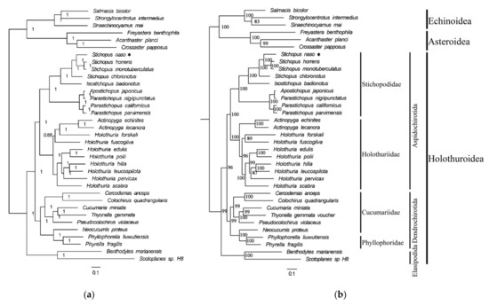 Phylogenetic trees constructed using the nucleotide sequences of the 13 PCGs in the Stichopus naso mitogenome. (a) BI method. (b) ML method. The numbers beside the nodes are posterior probabilities (BI) and bootstrap (ML), respectively.