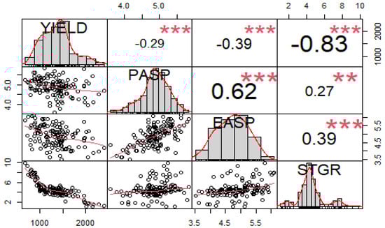 Correlation coefficients between low-N tolerance indicator traits and other agronomic traits of 169 early-maturing QPM inbred lines under low-N environments. YIELD = grain yield, PASP = plant aspect, EASP = ear aspect, EPP = ears per plant, STGR = stay-green characteristic. **, *** = Significant at 0.01 and 0.001 probability levels.