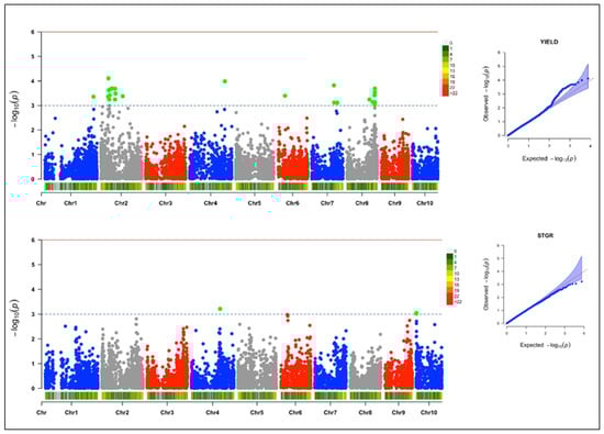 The Manhattan and Q–Q plots of the SNP-based association mappings for grain yield (YIELD) and stay-green characteristic (STGR) under low-N environments.