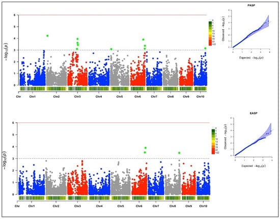 The Manhattan and Q–Q plots of the SNP-based association mappings for plant aspect (PASP) and ear aspect (EASP) under low-N environments.