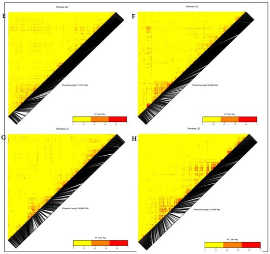 Heatmap LD haplotype blocks for different SNP markers located on different chromosomes. (E) Chromosome 6; (F) Chromosome 7; (G) Chromosome 8; and (H) Chromosome 10. The R2 colored key indicates the degree of significant associations with the putative gene.