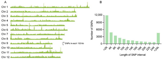 Characteristics of the SNPs used for array establishment in the whole genome of rice. (A) Distribution of SNPs along the 12 chromosomes. The height of the peaks indicates the numbers of each 100 kb region. (B) The frequency distribution diagram for the distance between the SNPs.