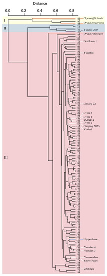 The collection of varieties was clustered into three groups (Figure 2). Group II contained five varieties, including Yunhui 290, which is a classical indica inbred variety (https://ricedata.cn/variety/varis/606611.htm (accessed on 30 April 2022)). This result suggests that the other four varieties, sharing a more common background with Yunhui 290 in group II, may represent indica varieties. Likewise, the varieties of group III grouped together with Nipponbare may represent japonica varieties. Introduced varieties, such as Dozikara-1, Yuanbai and Linyou 22, are clustered in group III, but into different subgroups. This result implies that these introduced varieties have been well utilized and introgressed into local varieties, therefore creating several new varieties. However, the varieties Lvmi 3, Lvmi1, SMGR 4, Lvmi 2, Nanjing 5055 and Xuebai were clustered together, which suggests that these introduced varieties share a highly common background and have not been well utilized by local breeders.