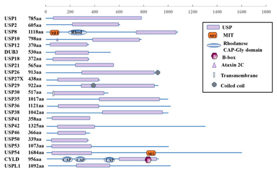 - Clague, M.J.; Barsukov, I.; Coulson, J.M.; Liu, H.; Rigden, D.J.; Urbe, S. Deubiquitylases from Genes to Organism. Physiol. Rev. 2013, 93, 1289–1315. [Google Scholar] [CrossRef]