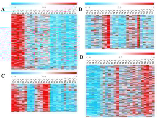 The K-means (k = 4) clustering of the relationship between samples and transcripts was performed based on the expression levels of the transcripts, and the clustering results were presented in heatmaps. The expression scales of the 25 groups of samples were normalized by the Z-Score, and the corresponding heatmaps were constructed using MEV 4.9.0 [31].
