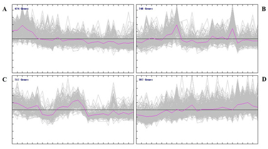 Clustering pattern of DEGs between different groups. (A) Cluster 1 of DEGs between different groups. The DEGs expression levels decreased with age in Laiwu black goats. (B) Cluster 2 of DEGs between different groups. A high expression of DEGs in the W2 and W8 groups and a low expression in the other groups. (C) Cluster 3 of DEGs between different groups. A high expression of DEGs in the D1 and W4 groups and an upregulation of the low expression in the other groups. (D) Cluster 4 of DEGs between different groups. The DEGs expression levels increased with age.