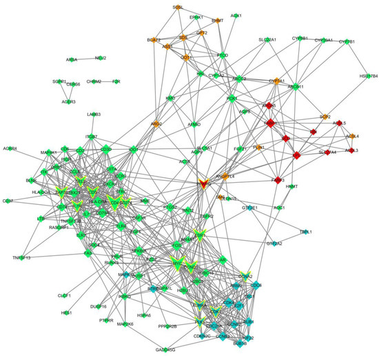 Protein–protein interaction networks of the KEGG pathway significantly enriched genes. Red indicates genes in cluster 1; orange indicates genes in cluster 2; blue indicates genes in cluster 3; green indicates genes associated with cluster 4; those with yellow boxes indicate key genes.