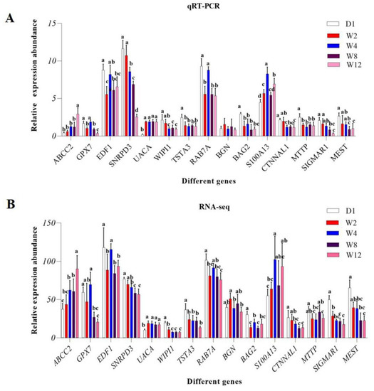 Table S3 displays the number of known and novel mRNAs in each library. As shown in Table 2, a total of 37,497 mRNAs were found in all libraries: 31,185 in D1, 31,369 in W2, 31,216 in W4, 31,064 in W8, and 31,143 in W12. Overall, 29,976 known mRNAs were detected in all libraries, which accounted for 79.94% of the total mRNAs. In the D1, W2, W4, W8, and W12 groups, 23,861 (73.37% of the total), 24,022 (76.58% of the total), 23,901 (76.57% of the total), 23,725 (76.57% of the total), and 23,725 (76.57% of the total) known mRNAs, respectively, were detected. A total of 7521 novel mRNAs were found in all libraries, including 7324 in D1, 7347 in W2, 7315 in W4, 7339 in W8, and 7344 in W12. The W8-1 library had the lowest number of known mRNAs, novel mRNAs, and total mRNAs (18,778, 7029, and 25,807, respectively). On the other hand, the D1-2 library had the most widely known mRNAs, novel mRNAs, and total mRNAs (19,620, 7091, and 26,711, respectively).