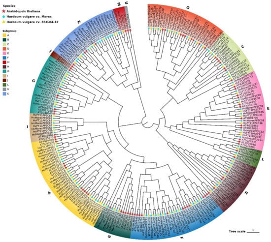 A phylogenetic ML-tree was constructed with all 1635 HvPP2C sequences (Figure S1). In order to obtain a clear view of the evolutionary relationship, two accessions, Morex and B1K-04-12, were chosen to represent cultivar and wild materials, respectively. Then, another ML-tree was constructed between 82 known Arabidopsis thaliana PP2C sequences, 85 identified barley Morex and 78 B1K-04-12 sequences, using MEGA-X software (Figure 1). The HvPP2Cs were divided into 12 subgroups based on the phylogenetic results, which is consistent with previous studies in Arabidopsis thaliana and Oryza sativa [], paper mulberry (Broussonetia papyrifera L.) [], woodland strawberry (Fragaria vesca L.) [] and potato (Solanum tuberosum L.) []. As a result, subgroup A possessed the most members (13 in B1K-04-12 and 14 in Morex), followed by subgroup F (11 in B1K-04-12 and 11 in Morex). Additionally, subgroups J and U, which were identified in Arabidopsis thaliana, did not exist for all barley PP2C members in this study. Compared with B1K-04-12, cultivar Morex has five more members in subgroup K than wild accession B1K-04-12. More research is needed to determine whether these variations in subgroup K were driven by domestication or simply individual differentiations. The code names “Morex” and “FT11”, which were used in the barley pan-genome research (25) of accessions Morex and B1K-04-12, remained in the renaming system in this study. Table S4 shows the MEGA-X model test result of this ML-tree. Additionally, Table S5 shows the subgroup classification and renaming information of the Morex and B1K-04-12 PP2C genes.