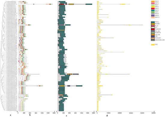 Phylogenetic, motif, conserved domain and gene structure analysis of HvPP2Cs in wild barley B1K-04-12. (a) Phylogenetic tree, (b) conserved motif distribution, (c) conserved domains and (d) gene structure.