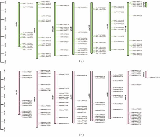 Chromosome distribution of HvPP2Cs in (a) B1K-04-12 and (b) Morex.