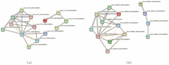 Network interaction analysis was performed using B1K-04-12 (Figure 7a) and Morex (Figure 7b) protein sequences, respectively. A total of 14 genes interacted with each other in B1K-04-12 and Morex.