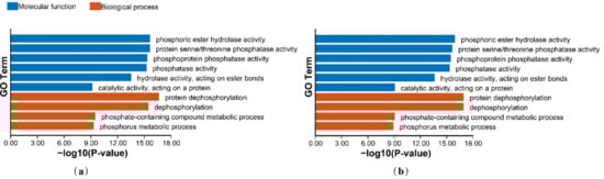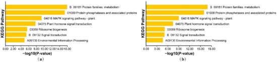 The GO annotation information is shown in Table S7. The enrichment results are shown in Figure 8. The KEGG annotation information is shown in Table S8. The enrichment results are shown in Figure 9. The GO enrichment results suggest that HvPP2Cs are primarily involved in phosphoric molecular activities and interact with numerous chemicals, such as ester hydrolase, protein serine/threonine and phosphoproteins in biological processes. The KEGG enrichment results suggest that HvPP2Cs are involved in metabolism, protein phosphatases and associated proteins, the MAPK signaling pathway, plant hormone signal transduction, ribosome biogenesis signal transduction and environmental information processing.